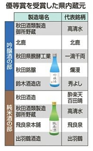 審査の結果、東北6県で「吟醸酒の部」39場40点、「純米酒の部」41場44点が優等賞に決まりました。秋田県は「吟醸酒の部」で5場5点、「純米酒の部」で4場4点の計9点が優等賞で、酒造技術が年々向上している東北の中で、今年は厳しい結果となりました。