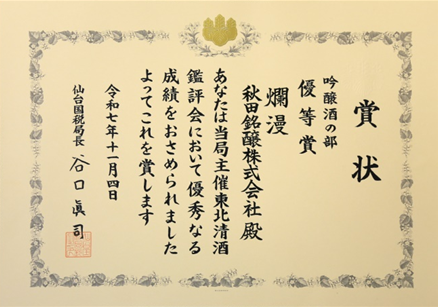 東北清酒鑑評会は、仙台国税局鑑定官室主催で1962年から毎年秋に開催されます。令和7年11月10日に審査の結果が公表され、美酒爛漫が「吟醸酒の部」で優等賞を受賞しました。